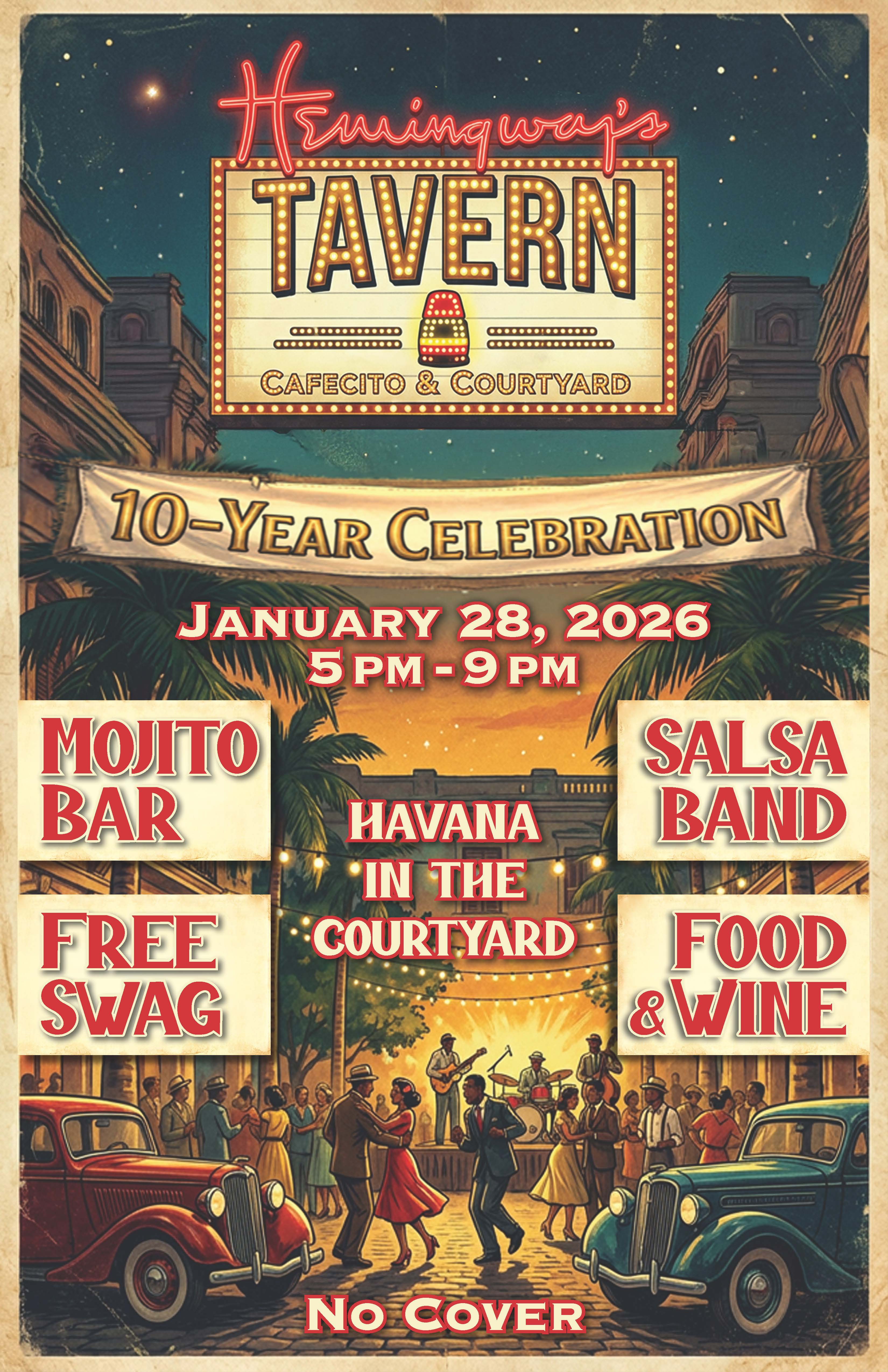 Hemingway's Tavern is turning 10, and we’re celebrating with the community that made it all possible. Join us for an Evening in Havana in our Courtyard filled with live music, great food, refreshing drinks, and plenty of photo-worthy moments as we toast 10 amazing years in Melbourne.